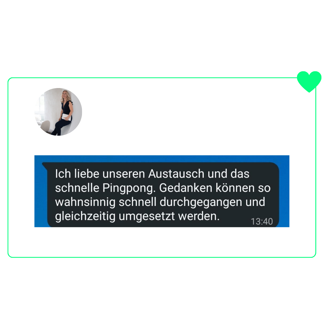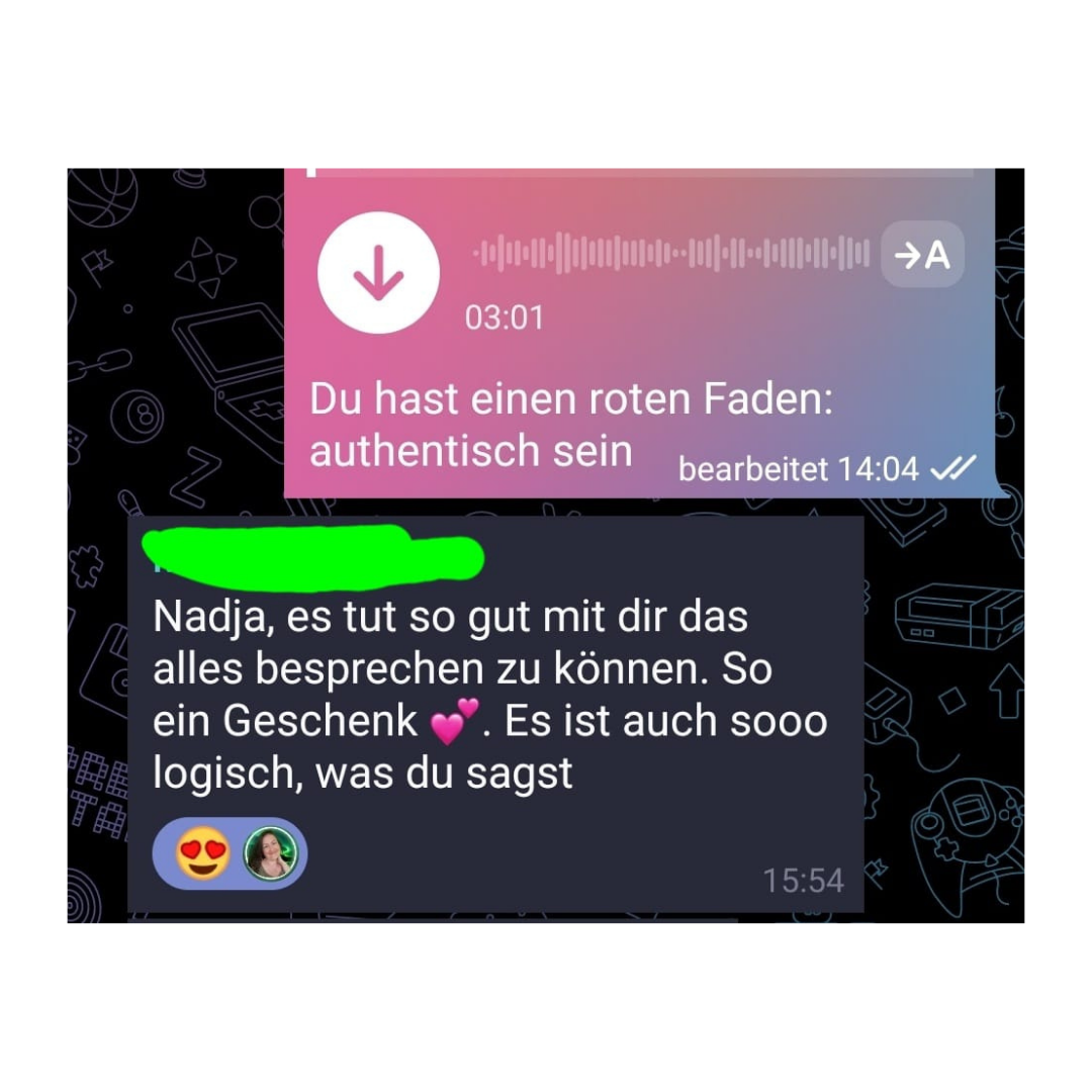 “Mir hat vor allem das hohe Tempo und die Intensität, der Fokus sehr gut gefallen in der Zusammenarbeit. Dann das Medium Telegram. Auch deine Flexibilität, wenn wir mal stockten, dann hast du geswitcht (bsp. mit den Audios und den Gegenüberstellungen..) Das hat mir als Generator sehr geholfen, denn offene Fragen sind manchmal so schwierig. Und ich schätze deine Sicht sehr. Du hast in mir erkannt, was mich einzigartig macht.”